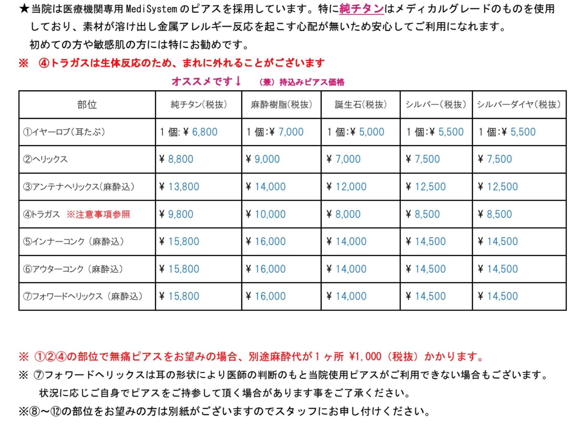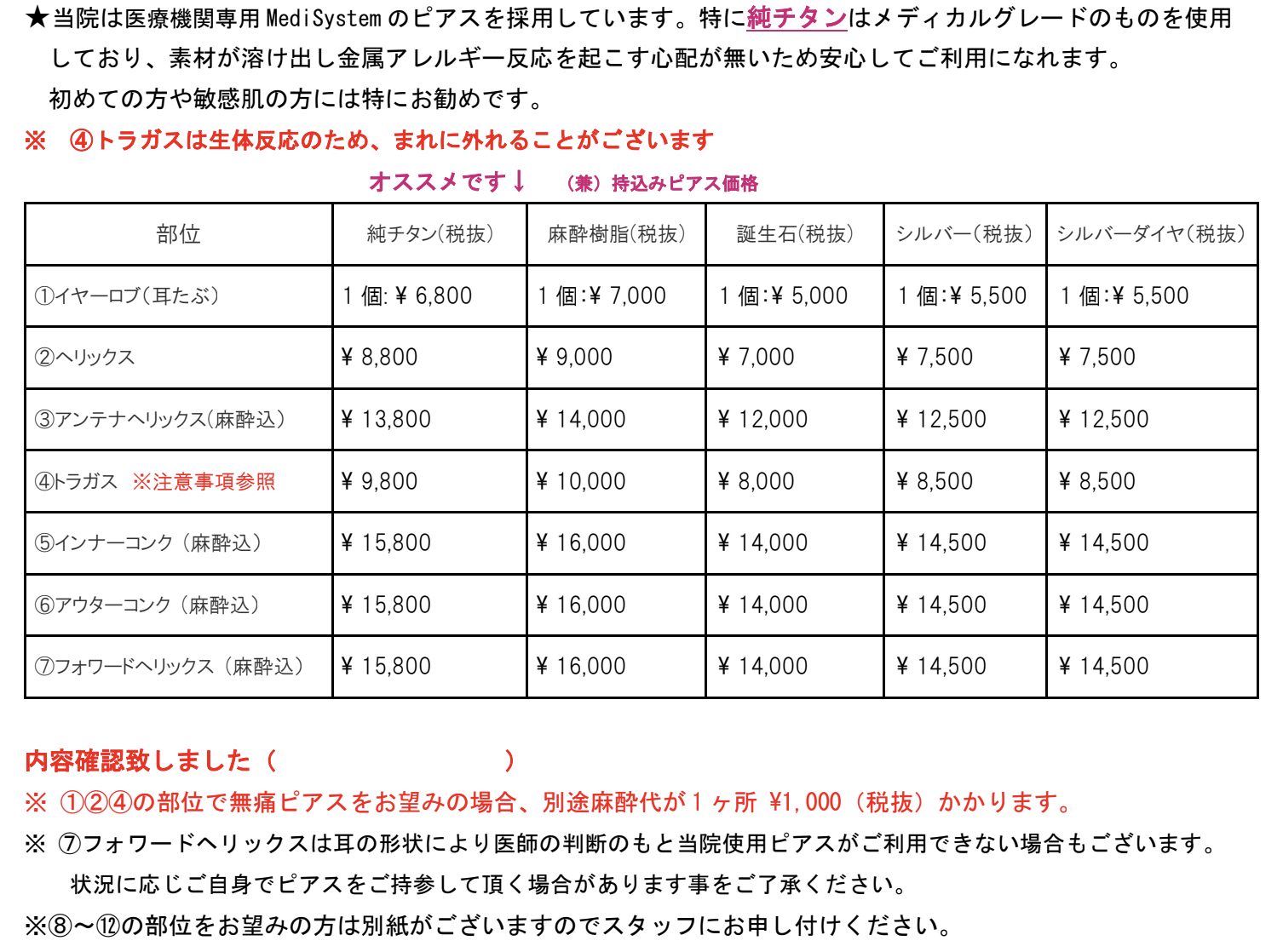 Piercing Prices(ピアス料金表)